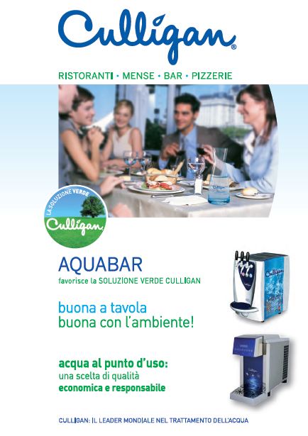 Acqua al punto d'usoL'acqua da bere in erogatori non é soltanto in bottiglia: l'esperienza Culligan® é servita a mettere a punto una serie di Erogatori/Affinatori "al punto d'uso" che rappresenta una valida alternativa all'acqua imbottigliata. Si tratta di apparecchiature che, collegate all'acqua di rete, provvedono ad affinarne le caratteristiche organolettiche, a refrigerarla, e, in certi casi, a gasarla per accontentare i gusti individuale dell'utente. Gli erogatori/affinatori trovano una perfetta applicazione in uffici, ristoranti, bar, locali pubblici, ma anche presso i privati: la "Fontanella" sta incontrando un crescente successo nelle cucine italiane. |